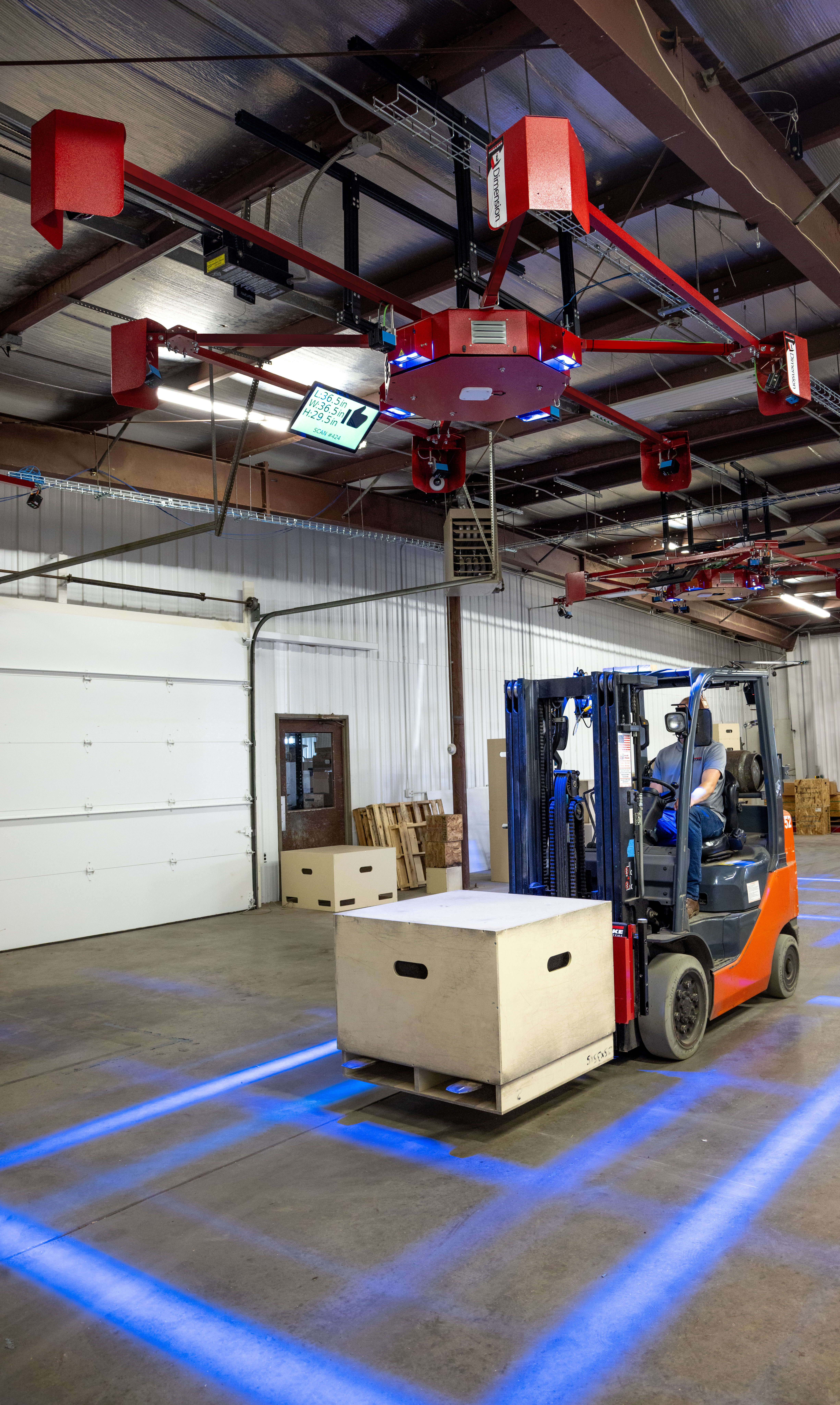 Forklift stops under the dimensioner, with the freight left on the forks, before triggering