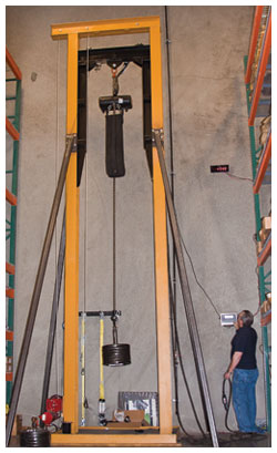 Because of the rising popularity of shows that require more sophisticated rigging, hoist-related accidents have risen at a similar ratio. The entertainment community has incurred quite a few serious accidents, from Spider-Man on Broadway to the building of Las Vegas’ City Center during which six deaths occurred. A renewed emphasis on safety is promoted industry-wide. Intelligent and informed selection of equipment in rigging situations and the fall protection applications (which include the use of force-reducing components or shock packs) can potentially reduce the frequency of these incidents to zero. The test weight drop demonstration has become an essential sales tool for SSWR&R’s shock absorbers. After watching a fatal fall from six feet, the same fall is reproduced with a shock absorber installed on the harness. Instead of 4000 pounds of force, the test weights incur a painful, but not fatal, 700 pounds of force. “I wouldn’t want to experience that kind of force,” Andrew smirks, “but at least it wouldn’t be the end of me.”