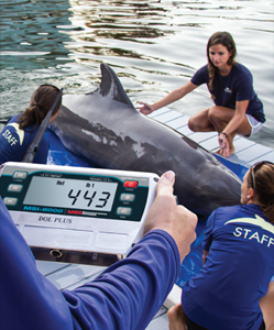 Diet and weight management is another large part of Dolphins Plus’ research and observation efforts. A full staff of veterinarians with the highly skilled trainers are able to study the dolphins’ behavior and weight fluctuations to key-in on any health issues. Even with a dolphin’s extraordinary communication skills, the number on the scale can paint a better picture of the dolphin’s wellbeing. A typical adult bottlenose dolphin weighs between 330 and 445 pounds, eating five to eight times a day with a diet consisting of restaurant quality, Grade A herring, capelin, sardine and a variety of smelt. If the dolphins are overfed and inactive, they become lethargic, uncooperative and potentially aggressive. On the other hand, if they are losing weight, it could signify a health issue. A reliable scale system is critical while trainers relay weight information to the veterinarian department. Together, they work to provide the best solution in healthcare for the animals.