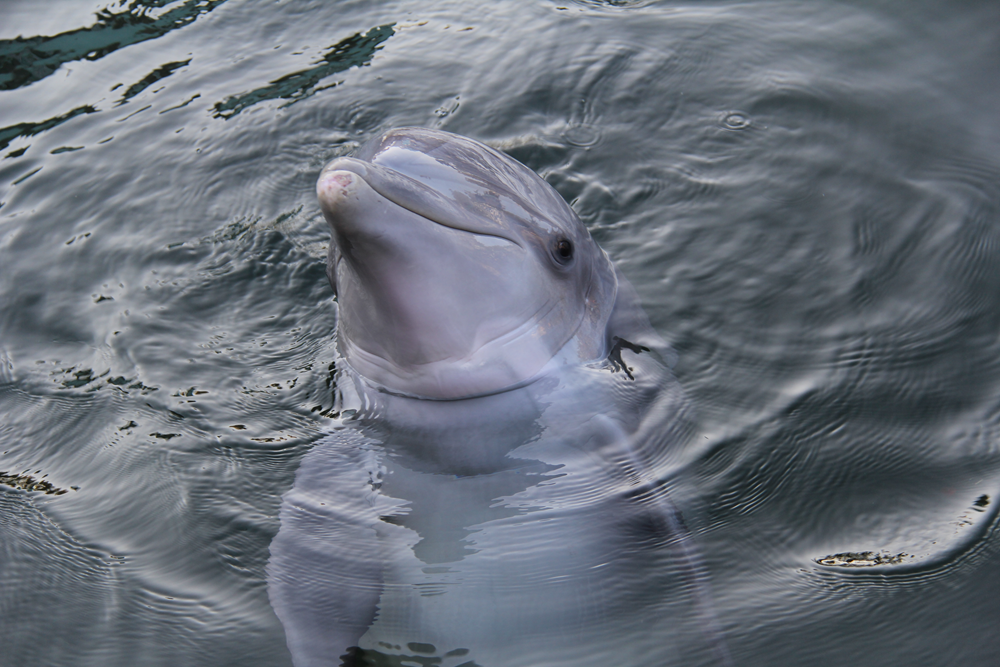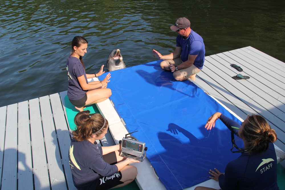 The educational programs are only one part of the staff’s daily responsibilities at Dolphins Plus. They scientifically observe and research behavior and communication in order to further their mission statement of marine mammal conservation and protection. Dolphins are well-known for three traits: communication, intelligence and social skills. They utilize verbal and non-verbal communication to express themselves, are able to learn and mimic behaviors, solve puzzles and teach each other behaviors. Bottlenose dolphins, like those at Dolphins Plus, communicate with clicks and whistle-like sounds, including a whistle that is unique to a specific dolphin known as their signature whistle. Developed within the first year of the dolphin’s life, signature whistles are just one part of the larger intelligent communication and socialization skills dolphins possess. They also display recreational behavior like acrobatic leaps above the water surface, self-made bubble rings and playing games of catch around the pod.