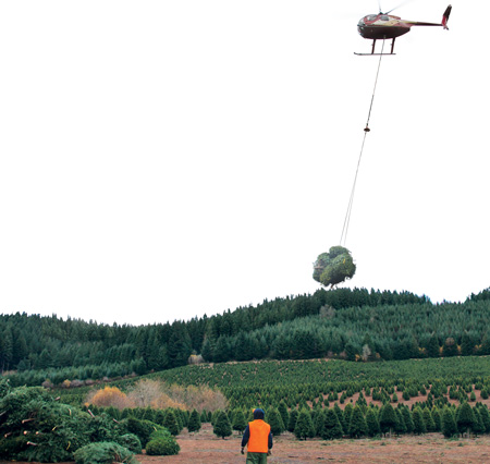 Where there was once a worker with a chainsaw and pick-up truck, now there is aerial assistance to lift and transport bundles of Christmas trees. Helicopter harvesting was an enormous innovation for the industry, providing a faster, less labor-intensive solution. When a group of trees has been cut and bundled, a saw operator signals for the helicopter, which hooks the bundle and carries it to a loading area. The pilot disengages the claw, the bundle drops and a small group of workers loads a large truck for ground transport.