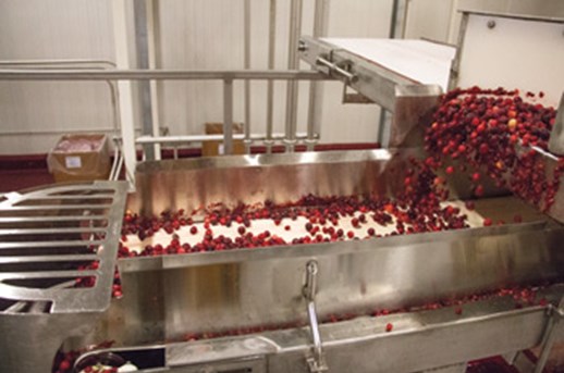 Cranberries are harvested each year from late September through October, then trucked to the Badger State Fruit Processing facility, where they are frozen and stored for up to a year before process-ing. During harvest season, approximately 200 trucks per week come in and out of the facility delivering cranberries. Processing this large amount of product makes reliable, streamlined systems essential.
