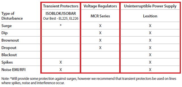 Once the problem has been defined, the solution can be implemented. Surges can be blocked by a simple inductive filter or a clamping device such as an avalanche diode. These devices are sometimes found as built into an outlet strip and sometimes use a Metal Oxide Varistor or MOV. Although an MOV can be effective for a while, it does degrade over time, and after a few surge events can be rendered completely ineffective with no indication that it is no longer providing protection. Using a more complete surge suppressor system provides a much more effective solution. Sags can only be overcome by a device that can boost the power to the recommended level. This requires a more sophisticated system that provides voltage regulation such as the Sola MCR series. Transients can be the most dangerous type of power disturbance to electronic circuits. The suppression of transients can vary from a simple combination of devices mentioned above, to a multiple stage active filtering and suppression circuit as in the EL226 AC Transient Protector.